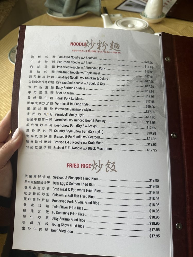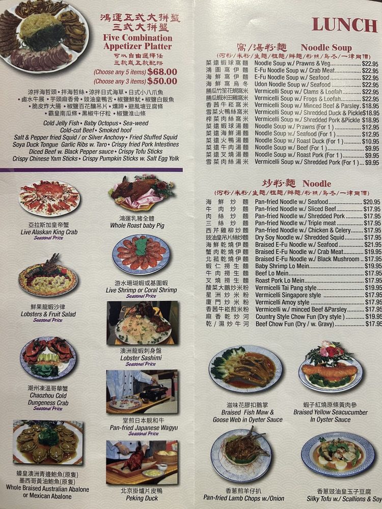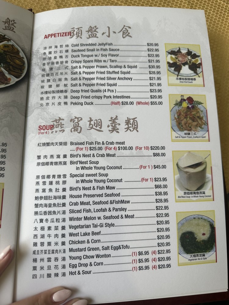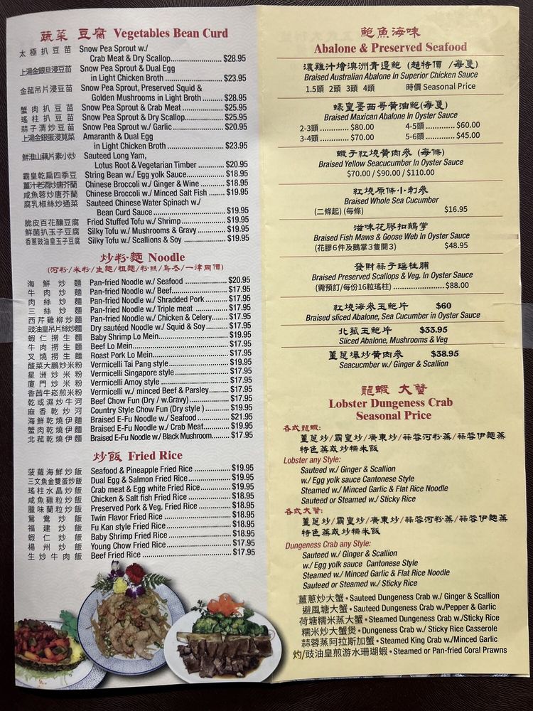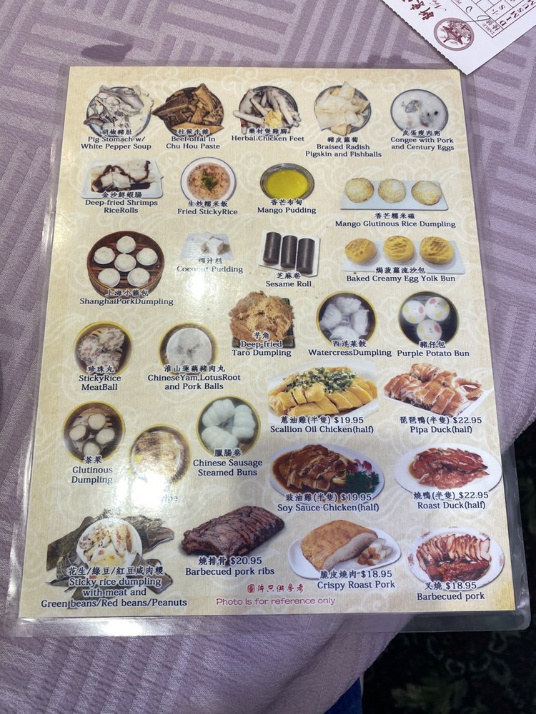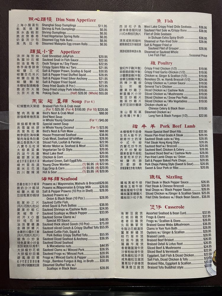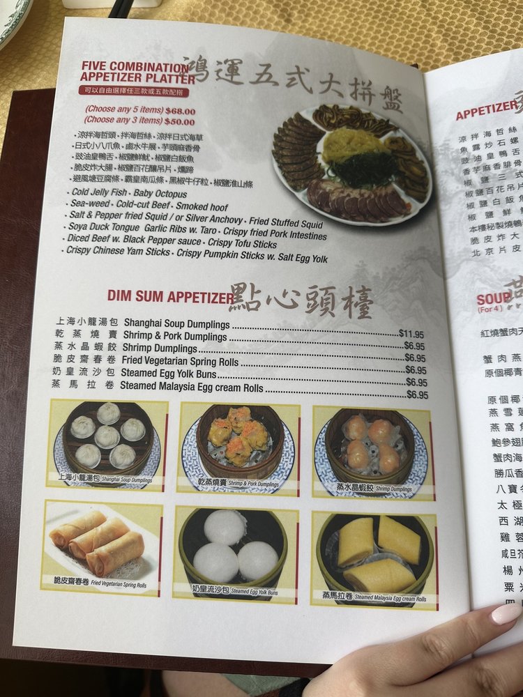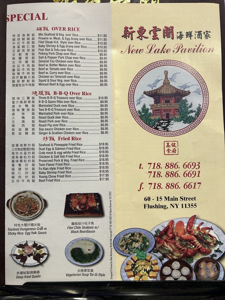 Introducing the menu at New Lake Pavilion in Flushing, NY, a top spot for seafood and dim sum lovers. The menu features a variety of appetizers including Shrimp Dumplings, Steamed Pork Dumplings, and more. Specializing in soups like Fresh Seafood Soup and Crab Meat with Fish Maw Soup. Indulge in Abalone and Preserved Seafood dishes like Braised Shark's Fin Soup and Braised Sliced Abalone. Customer reviews rave about the consistent and delicious dim sum, with highlights such as egg tarts and chashu buns. The restaurant offers valet parking for convenience and spacious dining rooms for special occasions. With a loyal customer base and a wide range of options, New Lake Pavilion promises a satisfying dining experience for seafood and dim sum enthusiasts.